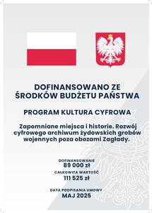 W ramach programu Kultura Cyfrowa zrealizowaliśmy projekt “Rozwój cyfrowego archiwum żydowskich grobów wojennych poza obozami Zagłady i edukacyjne wykorzystanie zasobów archiwum”. Głównym założeniem zadania było opracowanie, zdigitalizowanie i udostępnienie zasobów dziedzictwa dotyczących 25 nieupamiętnionych i dotąd nieprzebadanych miejsc pochówku żydowskich ofiar Zagłady w 25 miejscowościach w Polsce oraz opracowanie i udostępnienie 25 transkrypcji nagrań świadków.