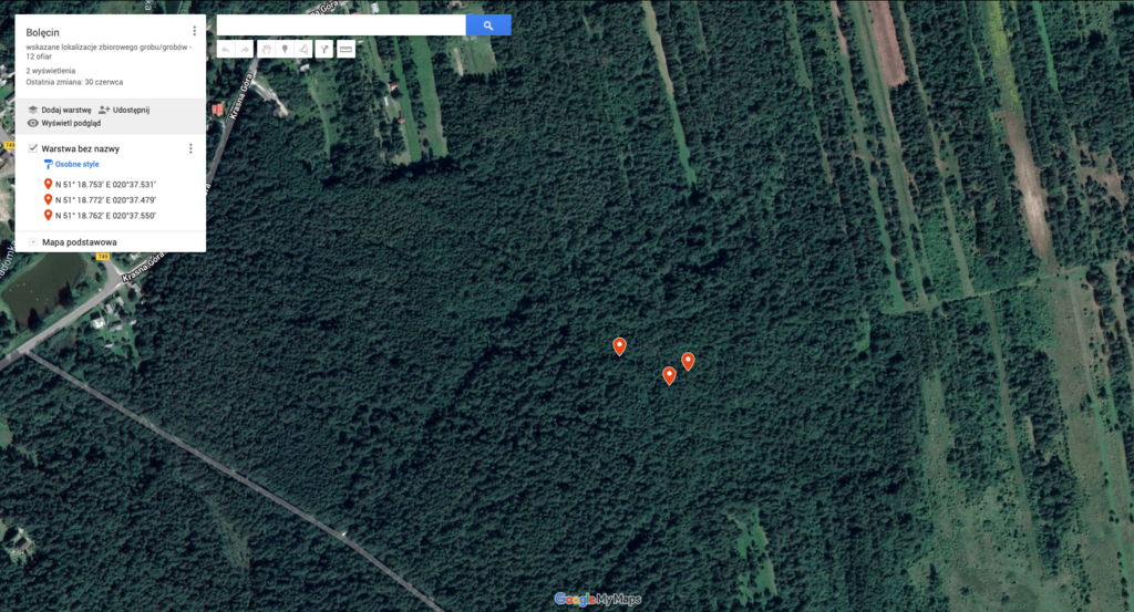 A forest, 30 metres away from the road leading from Radwany to Mroczki.Information about the crime