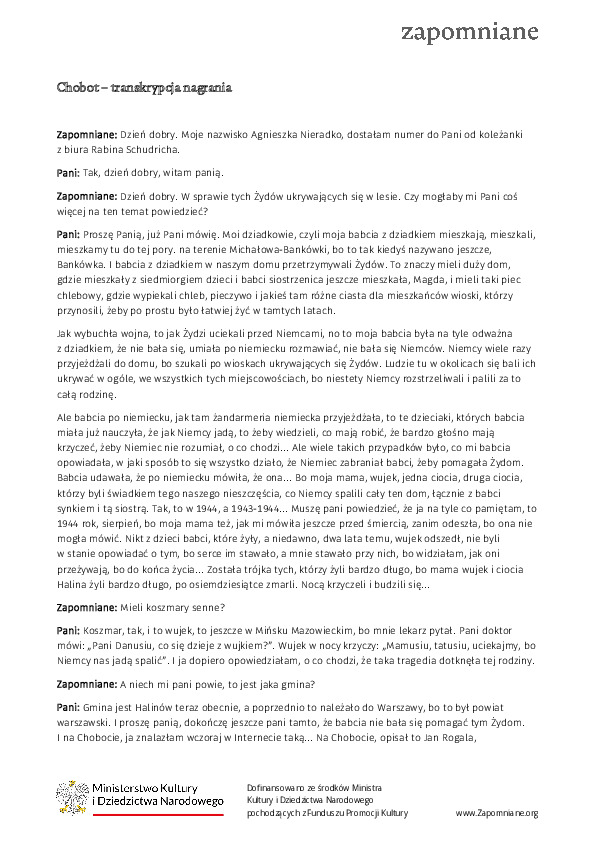 Nagranie Fundacji Zapomniane [zapis audio], Jan R. ur. 1922 r., rozmowę przeprowadziła Agnieszka Nieradko, Chobot, 2014 r.
