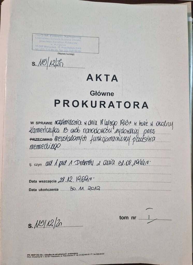 Akta Główne Prokuratora w sprawie rozstrzelania w dniu 18 lutego 1943 r. w lesie w okolicy Kamieńczyka 13 osób narodowości żydowskiej przez nieustalonych funkcjonariuszy państwa niemieckiego.