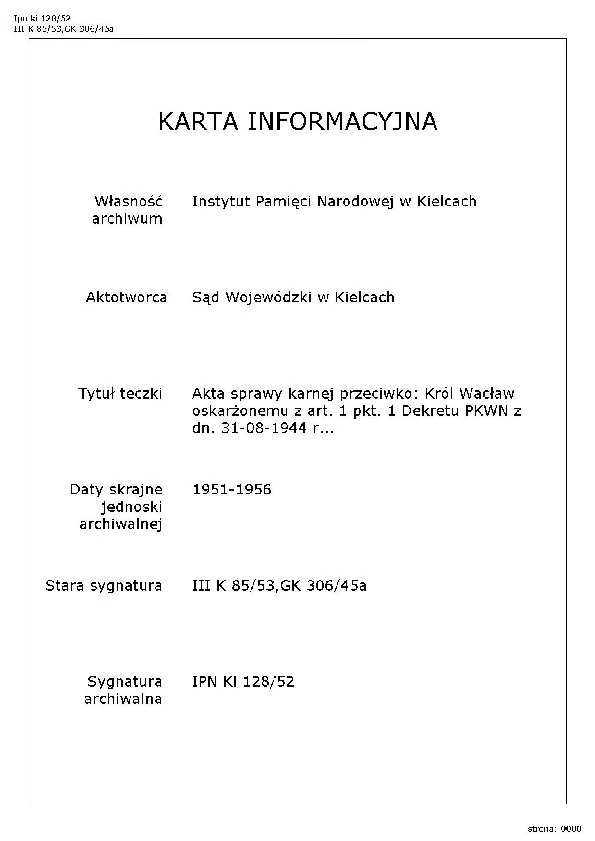 IPN Ki 128/52 Akta sprawy karnej przeciwko: Wacław Król, imię ojca: Antoni, ur. 25-09-1906 r. oskarżonemu z art. 1 pkt. 1 Dekretu PKWN z dn. 31-08-1944 r. o wymiarze kary dla faszystowsko-hitlerowskich zbrodniarzy winnych zabójstw i znęcania się nad ludnością cywilną i jeńcami oraz dla zdrajców Narodu Polskiego, tj. o to, że w czerwcu 1944 r. w Lasochowie, gmina Małogoszcz, jako funkcjonariusz policji granatowej wziął udział w zabójstwie obywateli polskich narodowości żydowskiej Izaaka i Lejby Rachmanów.