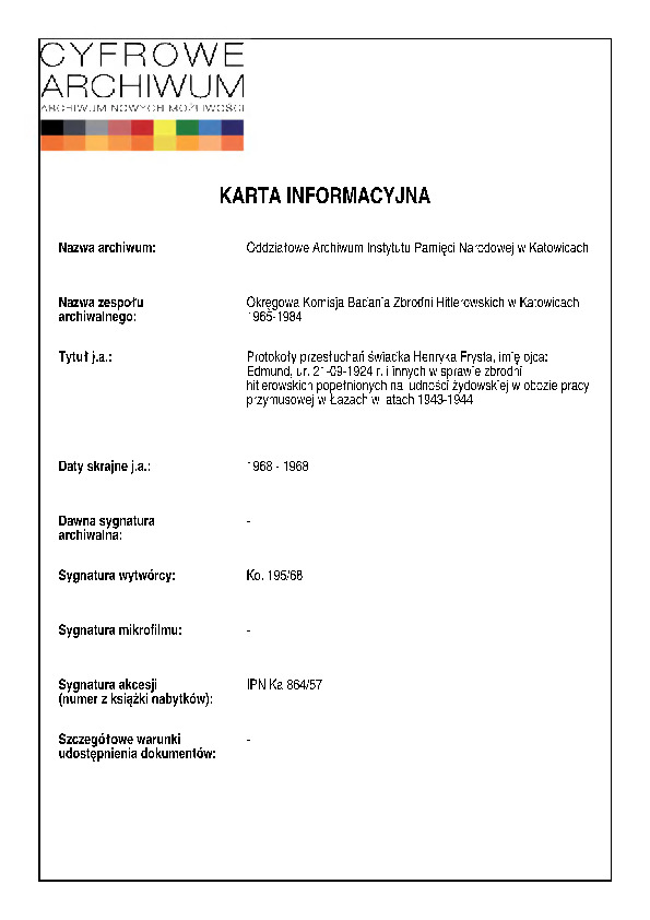 IPN Ka 864/57 Protokoły przesłuchań świadka Henryka Frysta, imię ojca: Edmund ur. 21-09-1924 r. i innych w sprawie zbrodni hitlerowskich popełnionych na ludności żydowskiej w obozie pracy przymusowej w Łazach w latach 1943-1944