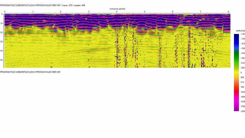 W dniu 19.08.2024 r. przeprowadzono wizję lokalną w miejscu precyzyjnie wskazanym (GPS:N 50°22.846′ E 019°22.202′) i oznaczonym jako lokalizacja zbiorowego grobu. Podczas oględzin obszaru przeprowadzono badania z użyciem georadaru (MALA X3M/500 Mhz). Zebrano 6 profili o nazwach LEK10001-LEK10006. Na zestawieniu echogramów LEK1 zaznaczono naruszenia warstw gleby w miejscu, które wytypowano jako lokalizację zbiorowego grobu. Naruszenia warstw gleby znajdują się na ok. 2.40 mb – ok. 6.0 mb. Przybliżony format grzebaliska to ok. 1.80 m x 3.60 m, głębokość ok. 0.9 – 1.0 m p.p.t. (Wyraźnie widoczne na profilach zakłócenia w postaci silnie rozmytego obrazu spowodowane są prawdopodobnie szumem elektromagnetycznym w zbliżonym zakresie częstotliwości do pracy anteny georadaru. Możliwe jest lokalne występowanie źródła zakłóceń. Nie należy jednak łączyć tych wyników z anomaliami spowodowanymi przez poszukiwane obiekty).
