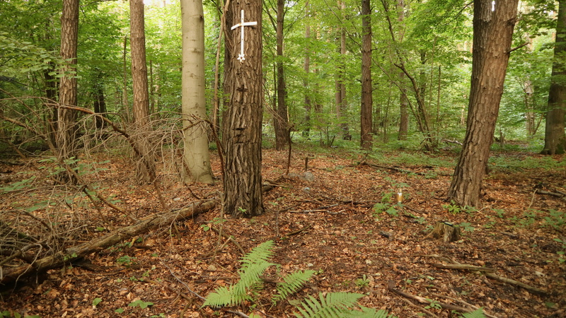 „Ale to może zaczniemy od początku z tego, co ja wiem. Mówię, jak na spowiedzi. No i z tego, co ja wiem. Wie pani co, tak. Mój dziadek był krawcem, i dawno chodzili ludzie na wieś, takie starsi panowie chodzili, i zawsze ich było tam trzech, może czterech, tego. I dziadek sobie szył, a oni se siedzieli na stołkach i tam opowiadali różne rzeczy ciekawe. No i między innymi opowiadali właśnie o tych Żydach, że ci Żydzi prawdopodobnie byli właścicielami, ale czy to jest prawda, czy nie, to przypuszczam idzie sprawdzić, no to może później dojdziemy do tego. Oni byli podobnież właścicielami wapiennika w Ząbkowicach. I oni tam w Ząbkowicach byli tam do czterdziestego bodaj trzeciego roku, chyba to było 8 sierpnia czy jakoś. Ale Ząbkowice miały to szczęście, że mieli dwóch komendantów bardzo łaskawych, podobnież, nie szkodzili ludziom, i także ten jeden z tych komendantów w tym czasie się o nich dowiedział, ale ich nie chciał mieć na sumieniu, i kazał im się po prostu wynosić, bo już było za głośno, że oni tam są. Kazał podobnież szukać innej mety. No i oni gdzieś sobie znaleźli metę, czy ktoś im, w Generalnej Guberni. A Generalna Gubernia była tutaj na podzamczu, jak Ogrodzieniec, bo tu była granica, bo my tutaj byli włączeni do Trzeciej Rzeszy. Szło siedem osób bodaj, 4 chyba kobiety, dwóch facetów i chłopczyk, jedni mówią 11 lat, drudzy 12, trzeci 13. Mały chłopczyk taki szedł z nimi. Ta jedna pani, ta młodsza, była w ciąży, już dosyć dużo w tej ciąży była. Ta druga miała coś koło czterdziestki, jeden facet z nich był starszy taki, co słyszałem od takiej pani, bardzo taki postawny kawał chłopa był. Jeden z nich, nie. No i oni… Tam ich ktoś wyprowadził z tych Ząbkowic, i oni doszli do Łęki, jak pierwsze domy są. No i tam był dom taki sam, można powiedzieć, na takich peryferiach, i oni, nie wiem, czy oni do niego weszli. Nazywał się Józef M. ten facet. No i on ich doprowadził do lasu. Właściwie to on nawet ich doprowadził na swoją działkę, bo to ludzie mieli działki w lesie. No i oni, jak szli, on ich tam zaprowadził, no ale że to było kawałek drogi, jak ona była w ciąży 7 miesięcy czy ileś, no to wiadomo, no przerwę. No a to był okres wiśniobrania i onej się bardzo zachciało wiśni. Może jedzenia też innego, no trudno mi jest powiedzieć. Ale między innymi wiśni jej się zachciało. No i on poszedł. Na pewno pieniądze mu dał, żeby przyniósł coś do jedzenia i tych wiśni, nie. No i on przyszedł do siebie do domu i miał syna… Znaczy on synów to miał chyba dwóch czy coś, i córki, nie wiem, no syna miał, on na kopalni, ja go pamiętam, tego faceta, robił na kopalni. No i przyszedł i mówi mu, żeby leciał, wsiadł na rower czy na nogach, do Łośnia, do komendanta, ten komendant się nazywał G. A on był Ślązak, on lepiej nawet mówił po niemiecku aniżeli po polsku. No więc ten komendant nie przebierając się, bo to była niedziela, wziął jeszcze jakiegoś drugiego policjanta i polecieli tam. Oni siedzieli pod krzakiem, pod leszczyną. I on wystrzelał pierwszych tych facetów, na końcu tę Żydówkę, tę w ciąży.” (31 marca 2023 r.)