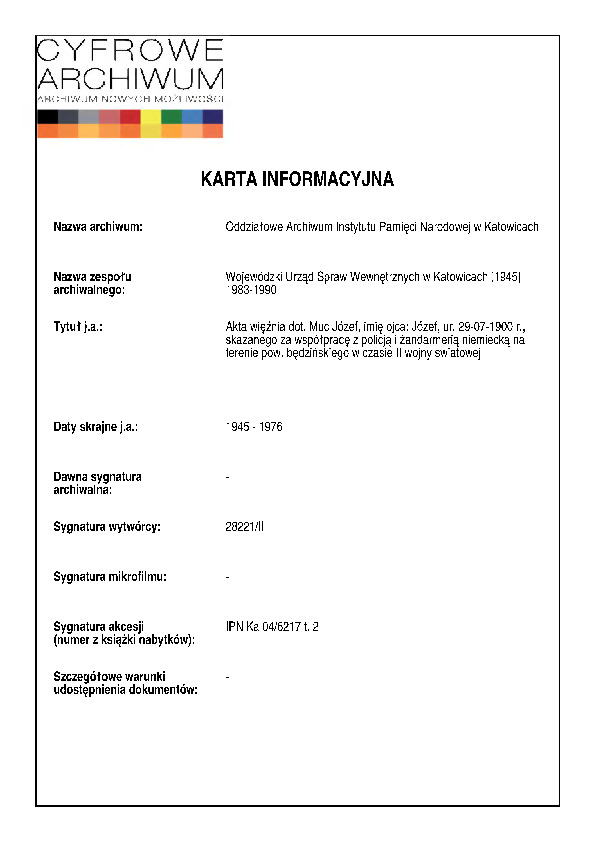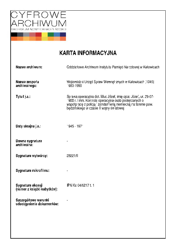 IPN Ka 04/6217 t. 1 i 2 Sprawa operacyjna dot. Muc Józef, imię ojca Józef ur. 29-07-1900 r. i inni. Kontrola operacyjna osób podejrzanych o współpracę z policją i żandarmerią niemiecką na terenie pow. będzińskiego w czasie II wojny światowej