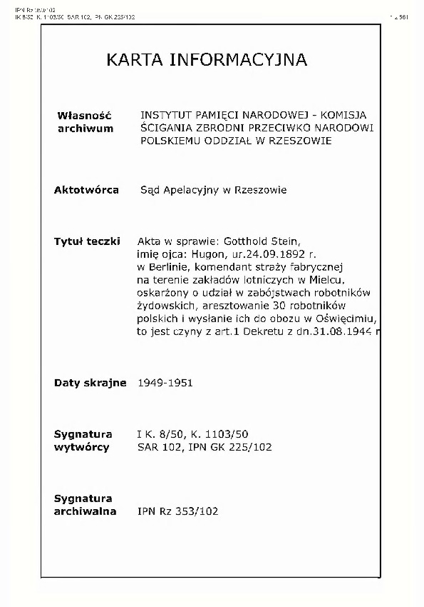 IPN Rz 353/102 Akta w sprawie: Gotthold Stein, imię ojca: Hugon, ur. 24.09.1892 r. w Berlinie, komendant straży fabrycznej na terenie zakładów lotniczych w Mielcu, oskarżony o udział w zabójstwach robotników żydowskich, aresztowania 30 robotników polskich i wysłania ich do obozu w Oświęcimiu, to jest czyny z art.1 Dekretu z dn. 31.08.1944 r.