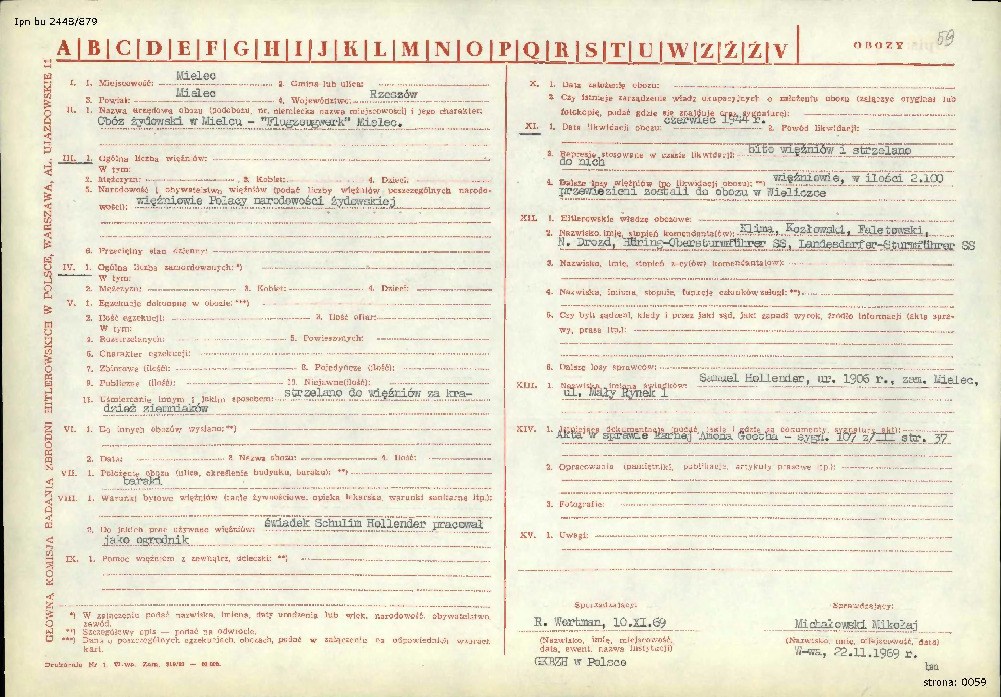 Gimpel Spielman l. 50, kupiec zamieszkały w Mielcu, były więzień obozu (zeznanie z 4 grudnia 1946 r.): […] „Początkowo przeciętny stan więźniów liczył 1500 ludzi, a później dochodził do ok. 3000 osób. Od 1943 r. były tutaj też kobiety w liczbie ok. 400 osób. W obozie znajdowało się jedno dziecko w wieku 3 lat, lecz niedługo, gdyż wkrótce zastrzelił je Drozd. […] Gdy w czasie marszu do pracy ktoś szedł niewyprostowany, wtedy takiego człowieka Stein [komendant obozu] zapisywała, a zaraz na drugi dzień zabierali go Werkschutze [straż obozowa] do Berdechowa i tam rozstrzeliwali gestapowcy i Werschutze. […] Zimmermann [jeden z gestapowców] nieraz przychodził do obozu, zabierał pewną ilość osób wedle swego upodobania i odprowadzał do Berdechowa, gdzie dokonywał rozstrzelania. […] W 1942 r. wybuchła w obozie epidemia tyfusu, w następstwie głodu, nieczystości i obozowego wiktu. Chorych brano na rozstrzelanie. Mało osób umarło śmiercią naturalną, gdyż przeważnie zabierano chorych do Berdechowa na rozstrzelanie. Nawet tych, co wyzdrowieli zabierali na rozstrzelanie. W czasie epidemii chorowało ok. 300 ludzi. W czasie trwania obozu stracono mniej więcej około 900 ludzi. Miejscem straceń był Berdechów, a ściślej miejsce koło lasu położonego obok lotniska w Mielcu.” (IPN Rz 1/17)