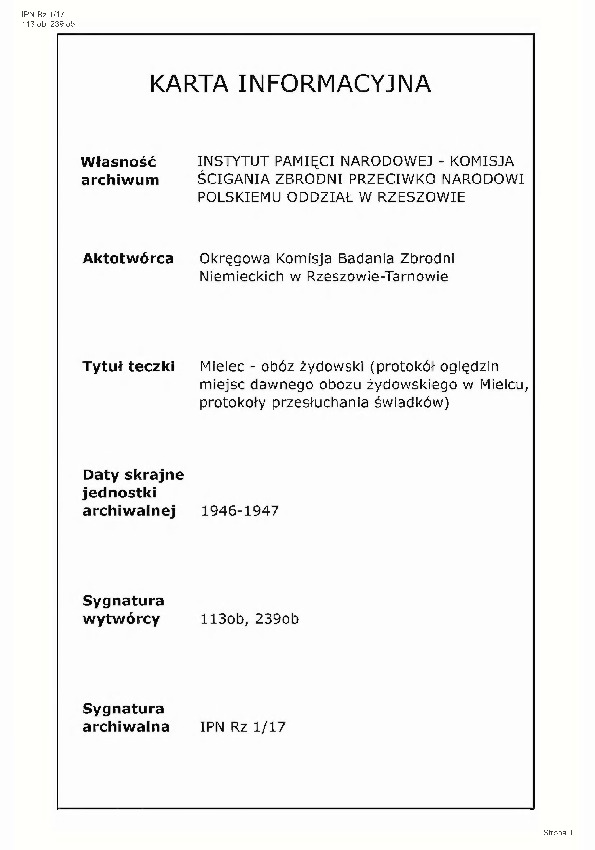 IPN Rz 1/17 Mielec obóz żydowski (protokół oględzin miejsc dawnego obozu żydowskiego w Mielcu, protokoły przesłuchania świadków)