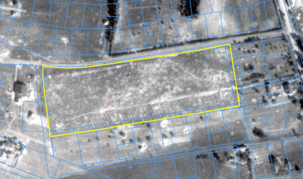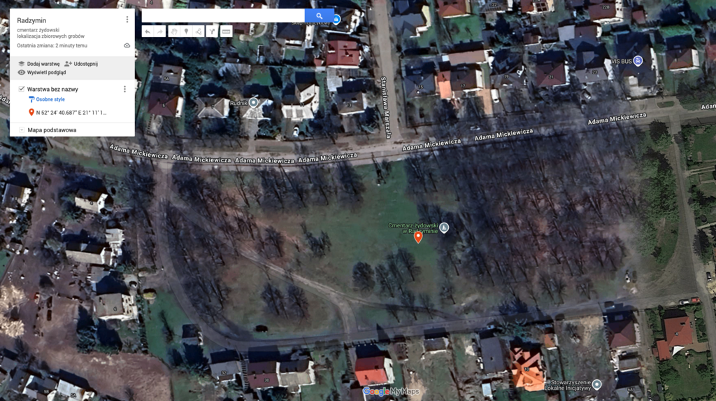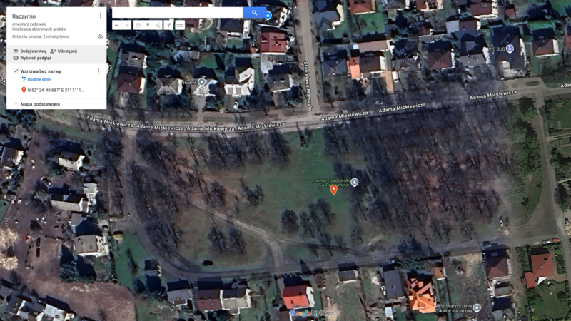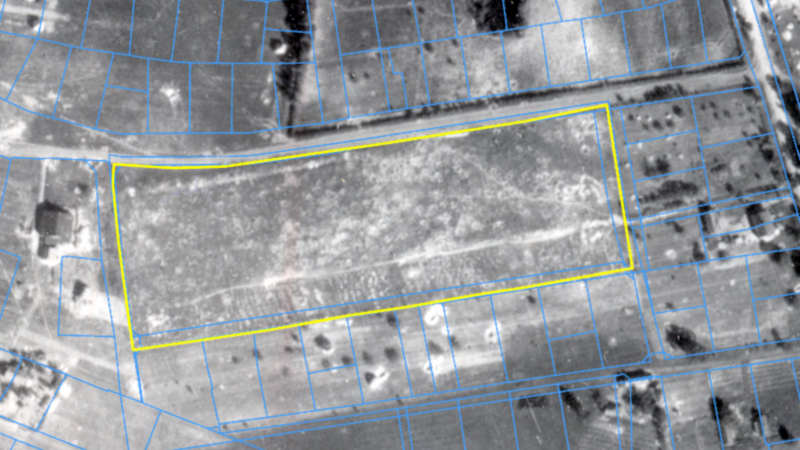 W celu poszukiwań zbiorowych grobów ofiar Zagłady na cmentarzu żydowskim w Radzyminie (GPS: N 52° 24′ 40.687” E 21° 11′ 13.865”), przy ul. Mickiewicza, pozyskano archiwalną fotografię lotniczą o sygnaturze GX 12387 wykonaną w dniu 06.09.1944 r.. Zdjęcie lotnicze obejmuje całość działki cmentarnej wskazując na historyczny przebieg granic (żółta linia). Granica północna biegnie wzdłuż krawędzi ulicy Adama Mickiewicza, od strony zachodniej widoczny delikatny łuk ulicy korespondujący z kształtem cmentarza w tym obszarze. Granica wschodnia przebiega w świetle ogrodzeń prywatnych posesji, które obecnie są położone przy ulicy Zielonej (niebieska linia). Granica południowa, podobnie jak wschodnia znajduje się w świetle granic posesji zlokalizowanych przy ulicy Zielonej. Przebieg granicy zachodniej nie wchodzi w kolizje z przebiegiem działek prywatnych posesji, które obecnie posiadają adresy przypisane do ulicy Adama Mickiewicza. Ulica Zielona służąca jako droga dojazdowa do prywatnych posesji znajduje się w obszarze oryginalnego przebiegu granic cmentarza.
