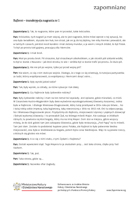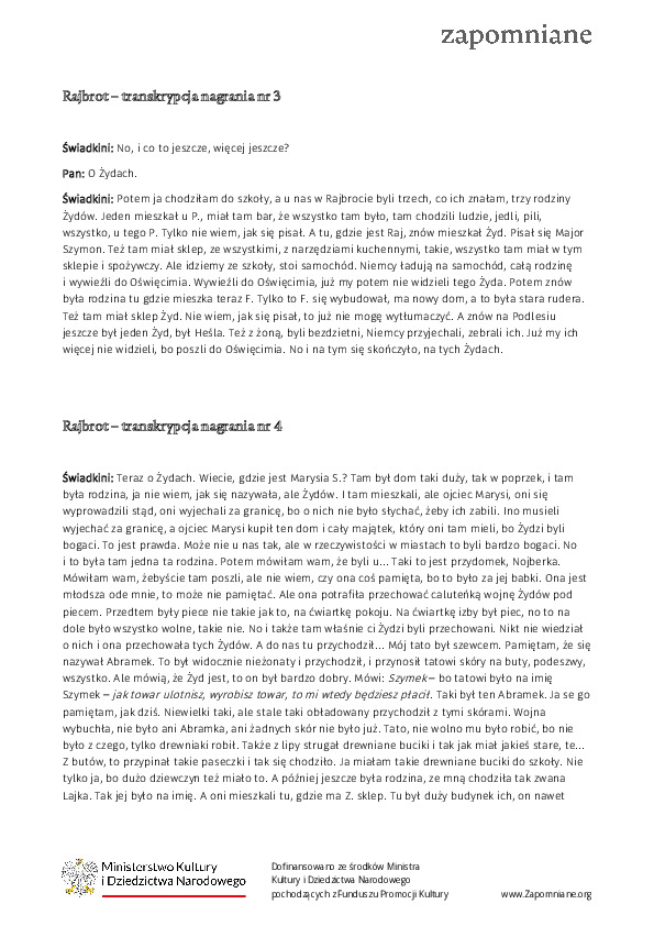 Nagranie Fundacji Zapomniane (zapis audio), Iwona Z. mieszkanka Rajbrotu, temat i słowa klucze: żydowskie groby w Rajbrocie. Rozmowę przeprowadziła Anna Brzyska, Rajbrot.