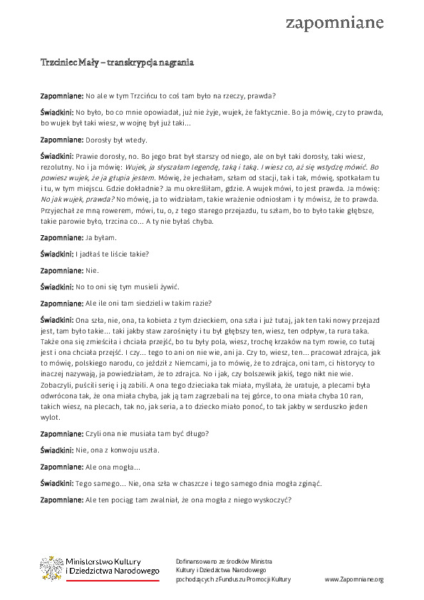 Władysława W. „Żydówka z dzieckiem uciekła z konwoju, zastrzelili ją jak uciekała. Skakała z pociągu podobno, uciekła z małym dzieckiem. Pociąg zwalniał przed semaforem i udało jej się uciec. Tutaj się przedostać miała, pod mostem przeszła w chaszczach i miała wyjść na drugą stronę i iść do wsi. A któryś zobaczył ją i puścili serię. To doczołgała się przez drogę, na drugą stronę drogi, bo jak leciała, tu były tory, przypuśćmy, tu był ten przejazd i tutaj droga była. To ona tu doszła do tej drogi i chciała iść do wsi, bo to nie było daleko. A że zobaczyli, to ona przez drogę przeciągnęła się na łąki i tam skonała. Tam tylko taka górka usypana jest. […] Ja miałam zdarzenie, jak jeszcze pociągi jeździły. Jechałam z Siedlec. Mgła była, nic nie było. Była tak, jakby kto mlekiem wylał. No i ja dochodzę i przed mostkiem właśnie stoi jakaś osoba. Ja dochodzę, tak jakby ona nie była pewna, gdzie ma iść. I ja ją dogoniłam, mówię: A pani idzie daleko?, a ona mówi: Nie. Mówi: Tu do swoich idę. Dobrze, mówię, to pójdziemy razem, mówię, Ale pani chyba to z daleka. Tak, z daleka. A to słyszę płacz dziecka, czy ja omamy mam, czy co, no ale słyszę, mówię: No to ma pani, mam tu bułkę, rogala, miałam tam pszenną, mówię: Ma pani, da dziecku jeść. I widziałam rękę, brała tego rogala, dawała dziecku. Zatrzepotał bażant gdzieś, ja się obejrzałam, znikło to wszystko. Jak ja wydarłam [uciekłam] do domu…