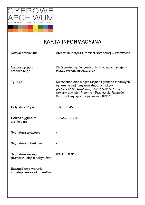 Materiały do tej strony zostały opracowane, zdigitalizowane i udostępnione w ramach projektu „Zapomniane miejsca i historie. Rozwój cyfrowego archiwum żydowskich grobów wojennych poza obozami Zagłady”, dofinansowanego ze środków Ministra Kultury i Dziedzictwa Narodowego pochodzących z Funduszu Promocji Kultury.